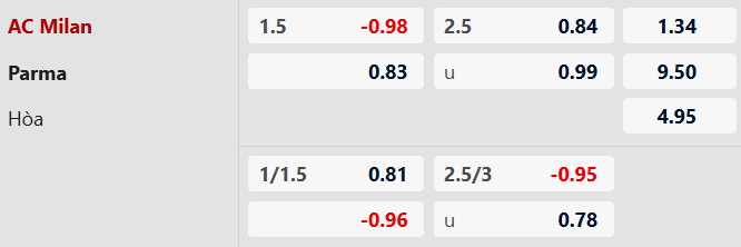 Thông tin tỷ lệ kèo bóng đá AC Milan vs Parma: