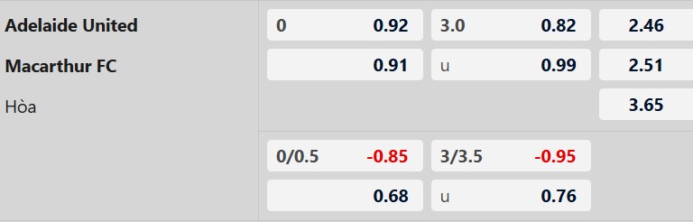 Thông tin tỷ lệ kèo Adelaide United vs Macarthur: