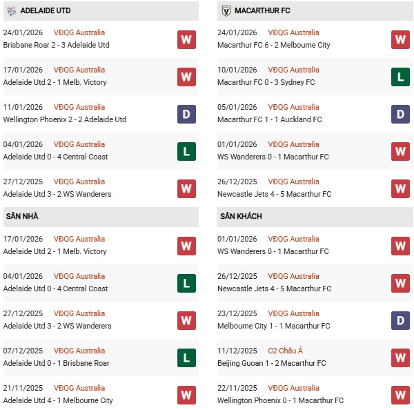 - Trên sân nhà, Adelaide United thắng 3, thua 2 trước Macarthur.