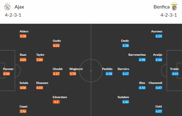 Tối đa 1 bàn trong hiệp 1: 5 trận chính thức gần nhất của Ajax có tối đa 1 bàn trong hiệp 1. 9/10 trận vừa qua của Benfica cũng chung kịch bản.