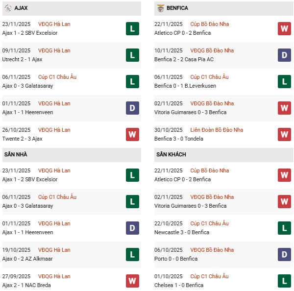 - Trên sân nhà, Ajax thắng 1, thua 2 trước Benfica.