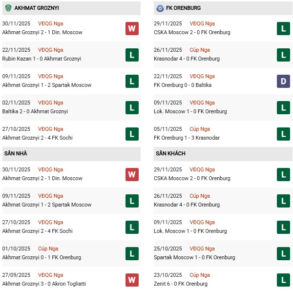 Trên sân khách, tình hình còn tồi tệ hơn khi Orenburg chỉ thắng 2/10 trận gần nhất. Hàng thủ mong manh, khả năng phản công kém hiệu quả và tâm lý thi đấu yếu đã khiến họ liên tục nhận thất bại. Việc phải hành quân đến sân của một Akhmat Grozny chơi khá tốt trên sân nhà khiến cơ hội có điểm của Orenburg trở nên rất thấp.