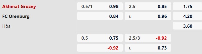 Thông tin tỷ lệ kèo Akhmat Grozny vs Orenburg: