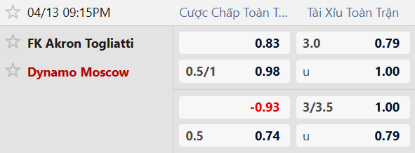 Thông tin tỷ lệ kèo Akron vs Dynamo Moscow: