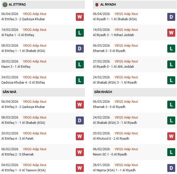 - Trên sân nhà, Al Ettifaq thắng 2, thua 1 trước Al Riyadh.