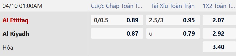 Thông tin tỷ lệ kèo Al Ettifaq vs Al Riyadh: