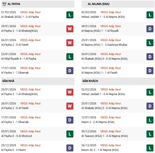 Al Feiha chưa từng thắng Al Najma trên sân nhà, nên nếu đội khách có kiếm được điểm ở trận đấu tới thì cũng không phải là chuyện lạ.