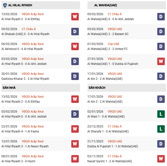 Phong độ đối thủ: Al Wahda (UAE) cũng có phong độ khá tốt khi đứng thứ 4, nhưng họ thường gặp khó trước các đội bóng lớn của Saudi. Trận hòa 0-0 trước Al Ahli ở vòng trước cho thấy hàng thủ của họ có tổ chức, nhưng để đứng vững trước hỏa lực của Al Hilal là một thử thách khác.