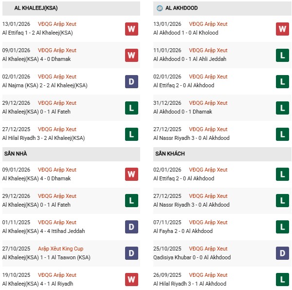 Xét phong độ, Al-Okhdood thắng 3, hòa 1 và thua 6 trong 10 trận gần nhất, phản ánh sự thất thường và tâm lý thi đấu chưa ổn định. Trên sân khách, thành tích của họ cũng không khá hơn với 3 chiến thắng, 1 trận hòa và 6 thất bại trong 10 chuyến xa nhà gần đây. Dù vẫn có khả năng gây bất ngờ trong những trận đấu cởi mở, nhưng nhìn chung Al-Okhdood thường gặp khó khi phải chịu sức ép liên tục.