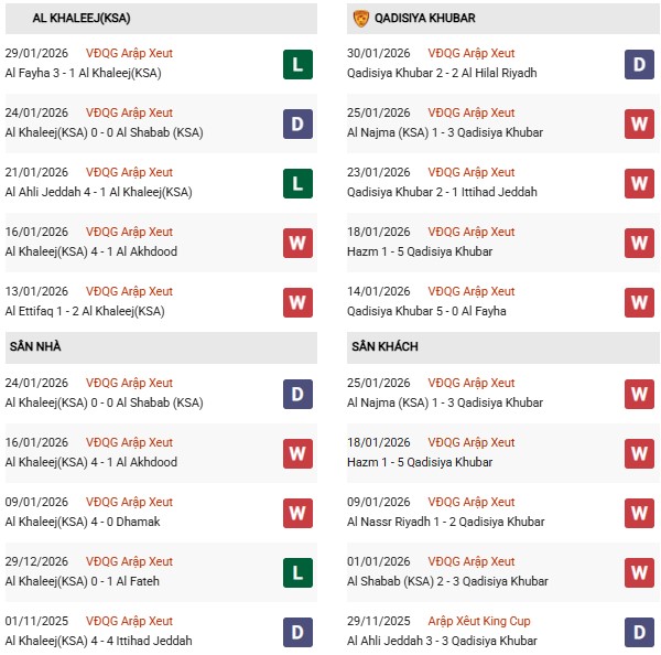 Đội bóng dưới quyền HLV Georgios Donis chỉ thua 2/7 trận gần đây thuộc giải VĐQG Saudi Arabia và cả hai thất bại còn trên sân khách. Tính từ đầu mùa 2025/26, Al Khaleej mới trắng tay 2 lần dưới mái vòm Prince Nayef Sports City.