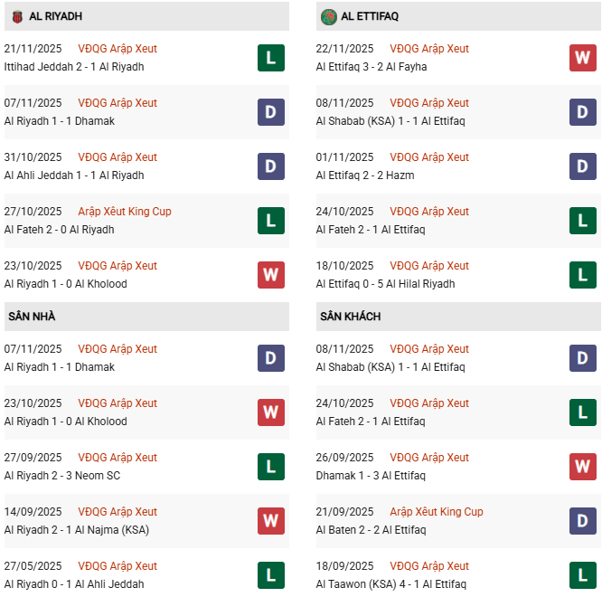- Trên sân nhà, Al Riyadh thắng 1, thua 1 trước Al Ettifaq.