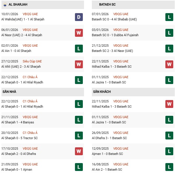 Thống kê phong độ Al Sharjah vs Al Bataeh: