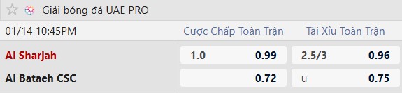 Thông tin tỷ lệ Al Sharjah vs Al Bataeh: