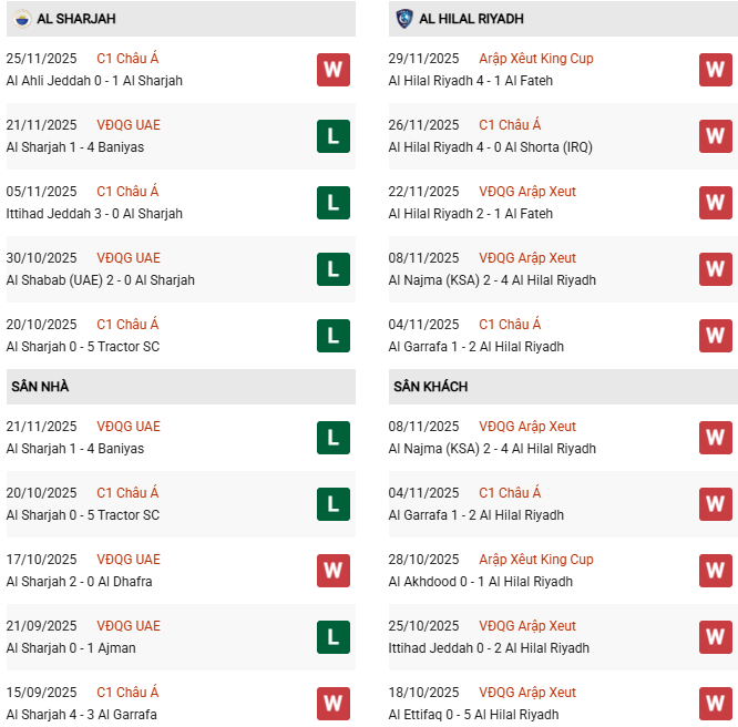 Thống kê phong độ Al Sharjah vs Al Hilal: