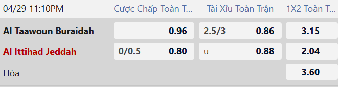 Thông tin tỷ lệ Al Taawoun vs Al Ittihad: