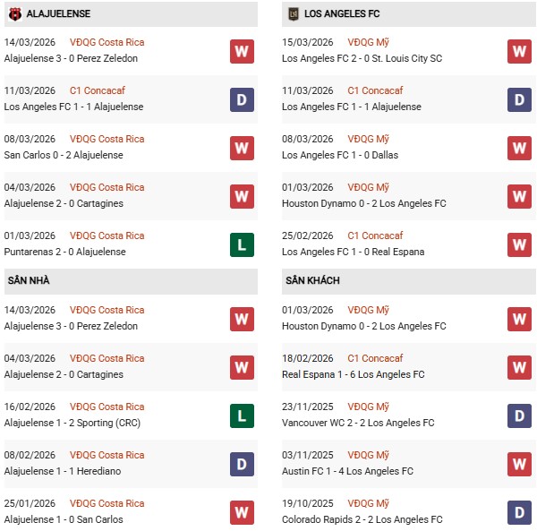 - Alajuelense thắng 1, hòa 1, thua 1 trong 3 trận gặp Los Angeles FC gần đây.