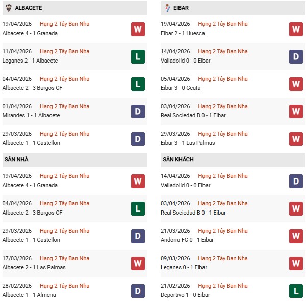 - Albacete thắng 4, hòa 4, thua 2 trong 10 trận gặp Eibar gần đây.