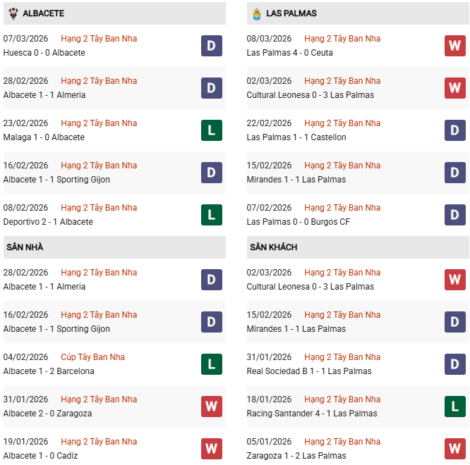 - Trên sân nhà, Albacete thắng 5, thua 2 trước Las Palmas.