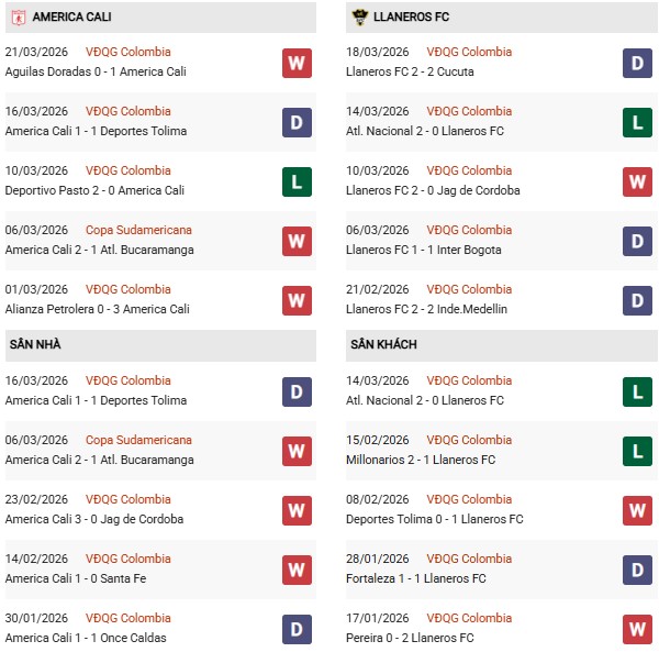 - America Cali thắng 3, hòa 5, thua 2 trong 10 trận gặp Llaneros gần đây.