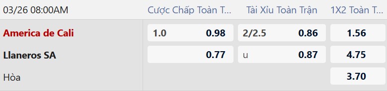 Thông tin tỷ lệ cược America Cali vs Llaneros: