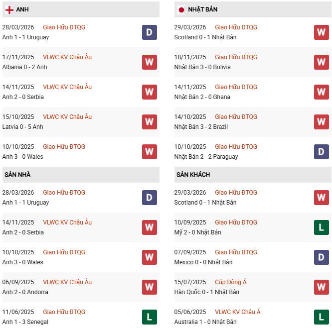 Thống kê phong độ Anh vs Nhật Bản: