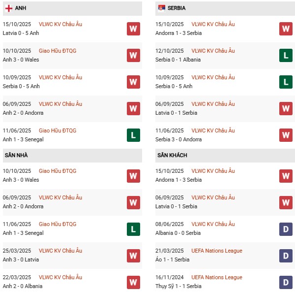Kết quả gần đây của Serbia khá trái chiều. Thất bại 0-1 trong trận cầu 6 điểm trên sân nhà trước Albania đã làm chậm đà tiến triển, mặc dù chiến thắng 3-1 trước Andorra đã phần nào giúp Serbia lấy lại tinh thần. Phong độ sân khách của Serbia khá ổn, với những chiến thắng trước Latvia và Andorra, nhưng cần nhấn mạnh rằng đối thủ của họ đều không phải quá mạnh. Chủ nhà Anh có lẽ sẽ là thử thách không dễ dành cho Serbia.