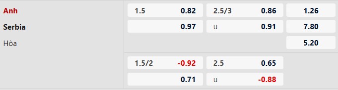 Tối đa 2 bàn thắng: Hàng thủ Anh chưa để thủng lưới bàn nào tại chiến dịch vòng loại, trong khi Serbia mới để thủng lưới 7 bàn sau 6 trận nhưng có tới 5 bàn ở trận thua tại lượt đi. Ở mặt trận tấn công, các chân sút tuyển Anh chỉ ghi 7 bàn trên sân nhà tại vòng loại. Với Serbia, 4/5 trận sân khách của họ có tối đa 2 bàn.