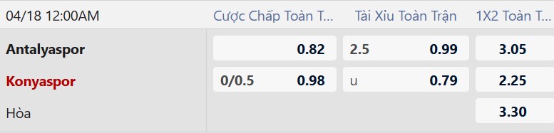 Thông tin tỷ lệ cược Antalyaspor vs Konyaspor: