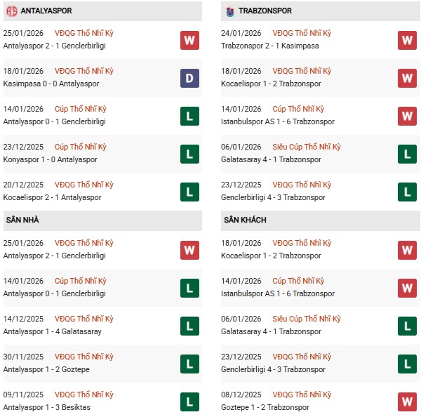 Thống kê phong độ Antalyaspor vs Trabzonspor: