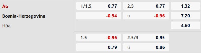 Tối thiểu 3 bàn cả trận: Cả 6 trận đấu gần đây của Bosnia và 6/9 trận sân nhà vừa qua của Áo đều kết thúc với tối thiểu 3 bàn thắng. Trận lượt đi giữa 2 đội ở vòng loại World Cup 2026 cũng xuất hiện 3 bàn thắng.