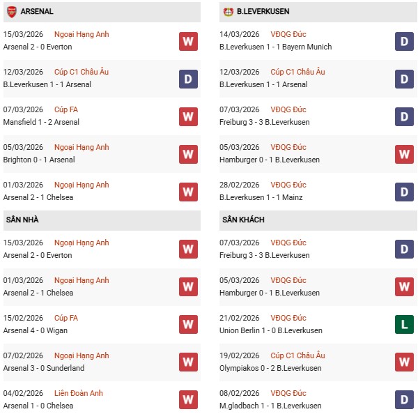Arsenal đang duy trì sự ổn định khá tốt. Họ bất bại trong 3 trận gần nhất trên mọi đấu trường. Chuỗi trận này bắt đầu bằng chiến thắng 2-1 trước Mansfield tại FA Cup, tiếp đó là trận hòa 1-1 với chính Leverkusen ở lượt đi Champions League. Cuối tuần vừa qua, “Pháo thủ” tiếp tục khẳng định phong độ khi đánh bại Everton 2-0 tại Premier League. Thành tích sân nhà của Arsenal cũng rất ấn tượng khi họ thắng 5 trong 6 trận gần nhất tại Emirates, ghi 15 bàn và chỉ để thủng lưới 4 lần.