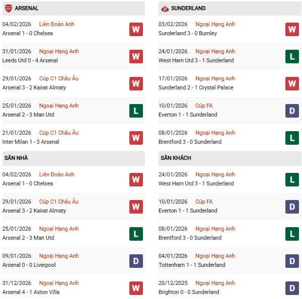 Sunderland chưa từng thắng trong 16 trận sân khách tại Premier League trước Arsenal (5 hòa, 11 thua). Hiện tại, Mèo đen cũng đang sở hữu chuỗi xa nhà rất tệ hại. Họ chưa thắng trận nào trong 7 trận sân khách gần nhất tại Premier League (3 hòa, 4 thua) kể từ chiến thắng 2-1 trước Chelsea hồi tháng 10/2025.