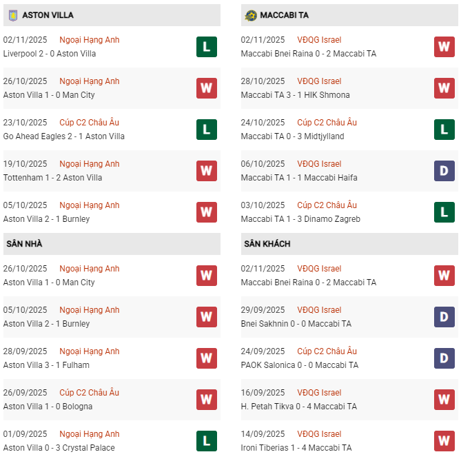 Thống kê phong độ Aston Villa gặp Maccabi Tel Aviv: