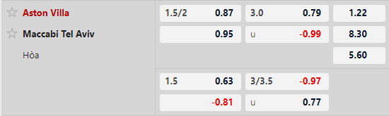 Thông tin tỷ lệ kèo bóng đá Aston Villa gặp Maccabi Tel Aviv:
