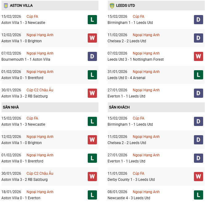 Lịch sử đối đầu cũng ủng hộ Villa khi họ bất bại bảy trận liên tiếp trước Leeds, thắng bốn trong năm lần chạm trán gần nhất. Ở lượt đi tháng 11/2025, Villa thắng 2-1 ngay tại Elland Road. Với ưu thế sân nhà cùng sự chắc chắn nơi hàng thủ, Villa được đánh giá cao hơn trong cuộc đối đầu này.