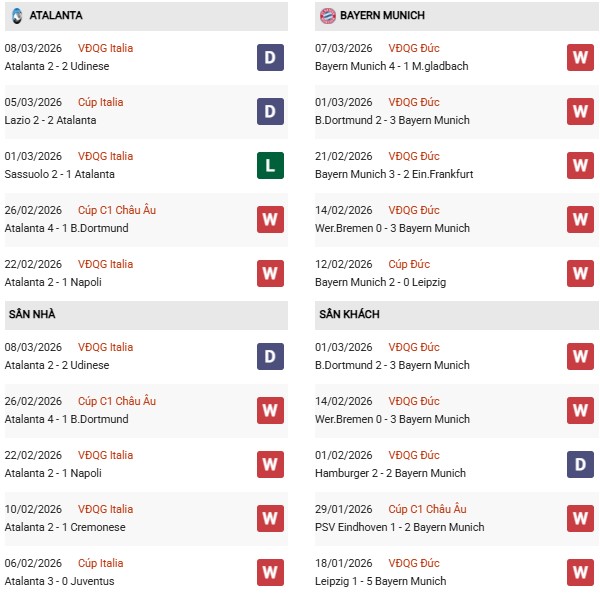 Thống kê phong độ Atalanta vs Bayern Munich: