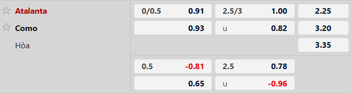 Toàn bộ 6 lần gần nhất hai đội gặp nhau kèo Tài đều xuất hiện. 90 phút ở trận lượt đi mùa trước còn có đến 5 lần lưới rung. Tuy nhiên, với bối cảnh Atalanta mùa này đang chơi cực kỳ thực dụng còn hàng công của Como mới có 6 pha lập công, khó để trông chờ vào một trận cầu bùng nổ. Tỷ lệ tài xỉu 2 3/4 từ đó cũng sẽ phù hợp hơn dành cho sự xuất hiện của kèo Xỉu chung cuộc.