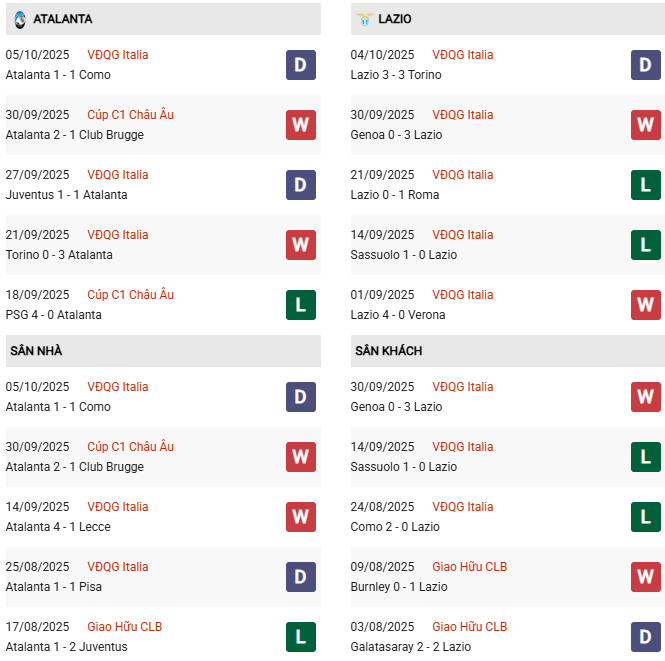 Về đối đầu, cán cân những năm gần đây gần như cân bằng. 10 lần chạm trán gần nhất, Atalanta thắng 3, hòa 3 và thua 4. Tuy nhiên, trên sân nhà, Atalanta lại lép vế khi chỉ thắng 2 và thua 3 trong 6 lần tiếp Lazio. Mùa trước, chính tại Bergamo, Lazio thắng 1-0 nhờ lối chơi kỷ luật và phản công sắc bén.