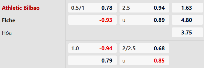 Soi kèo châu Á Athletic Bilbao vs Elche:
