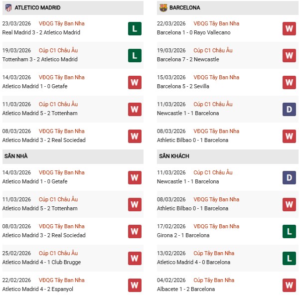 Thống kê phong độ Atletico Madrid vs Barcelona: