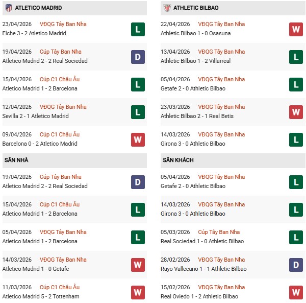 - Trên sân nhà, Atletico Madrid thắng 7, thua 2 trước Bilbao.