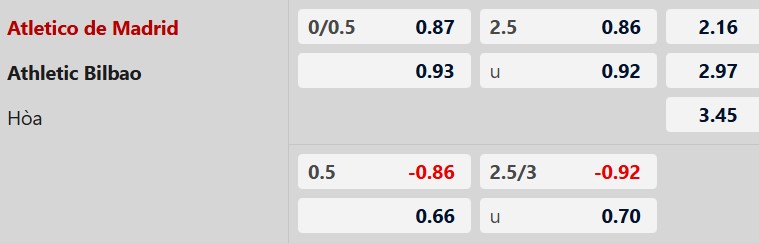 Thông tin tỷ lệ kèo bóng đá Atletico Madrid vs Bilbao: