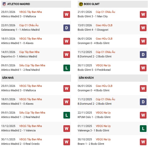 Thống kê phong độ Atletico Madrid vs Bodo Glimt: