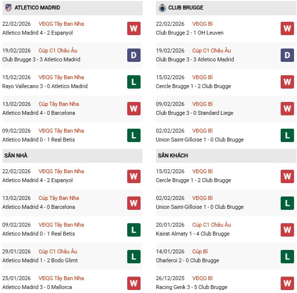 - Trên sân nhà, Atletico Madrid thắng 1, hòa 1 trước Club Brugge.