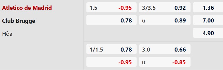 Soi kèo châu Á Atletico Madrid vs Club Brugge: