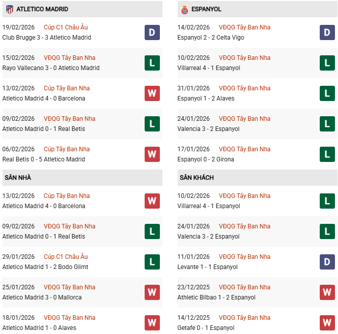 - Trên sân nhà, Atletico Madrid thắng 6, thua 1 trước Espanyol.