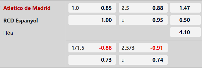 Thông tin tỷ lệ kèo bóng đá Atletico Madrid vs Espanyol: