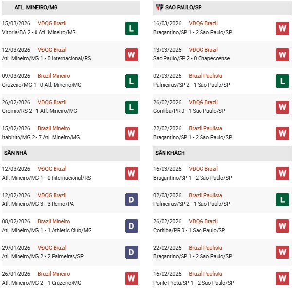 - Atletico Mineiro thắng 4, hòa 5, thua 1 trong 10 trận gặp Sao Paulo gần đây.