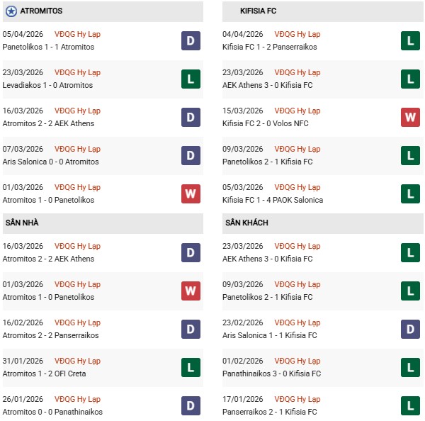 - Trên sân nhà, Atromitos thắng 1, thua 2 trước Kifisia.