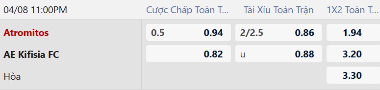 Thông tin tỷ lệ cược Atromitos vs Kifisia: